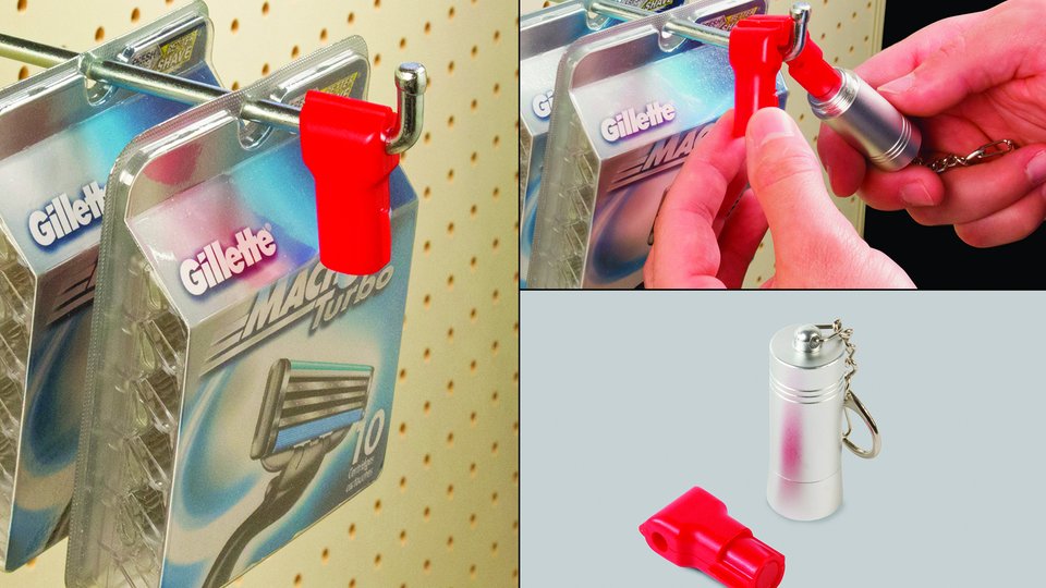The Magnetic Peg Hook Lock is an affordable and effective theft deterrent device for product displayed on peg hooks, including razor blades, ink cartridges, electronics, and more. Merchandise cannot be removed from the display until an employee opens the lock with the magnetic key.